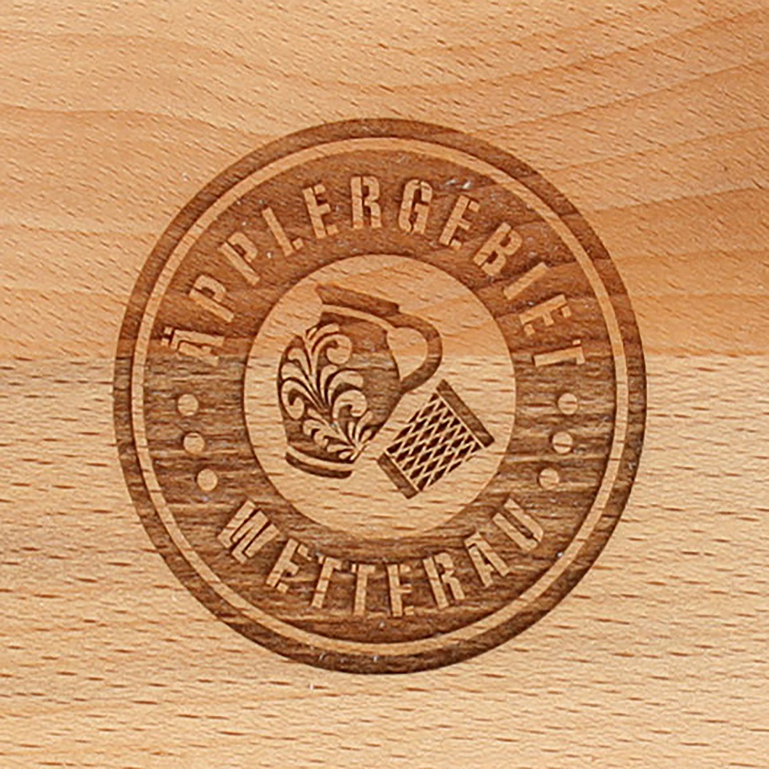 Unser Brettchen aus Buchenholz mit Äpplergebiet-Motiv zeigt jedem direkt an, wo man zu Hause ist. Nur noch die Worschd druff und schmecke lasse!