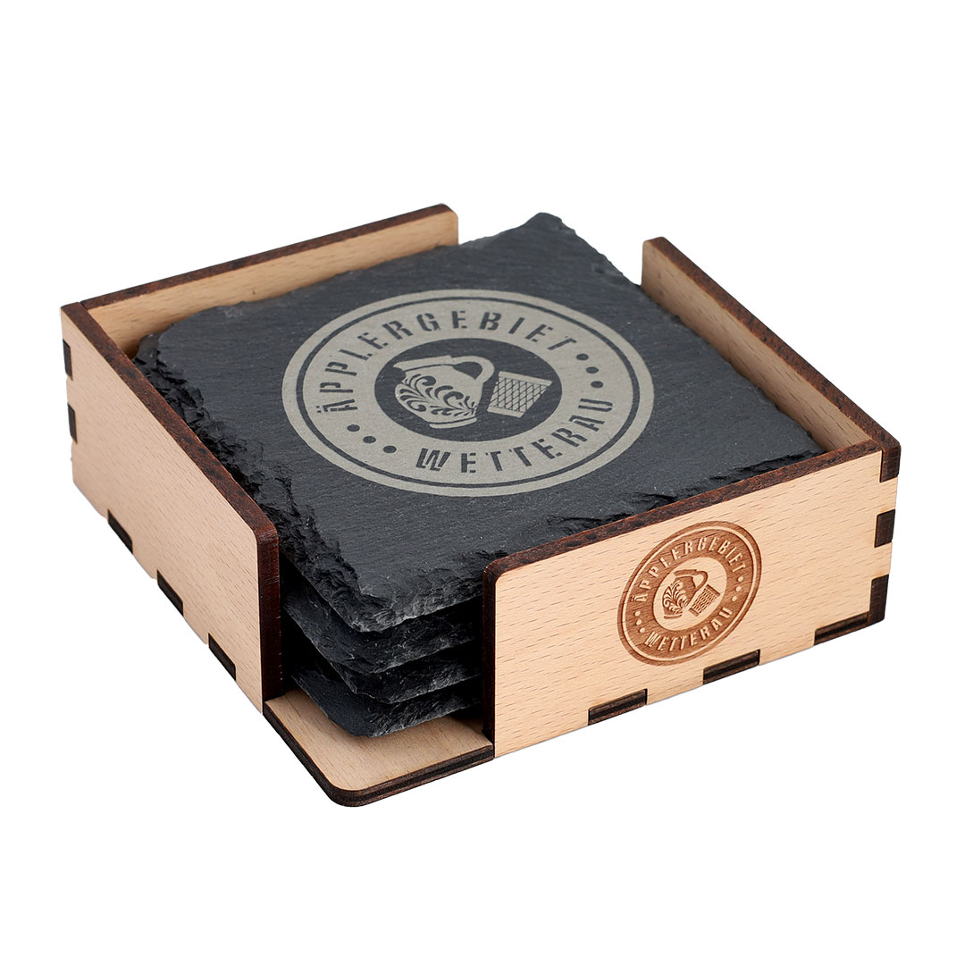 Set mit 4 Untersetzern in einer schönen Holzbox.
