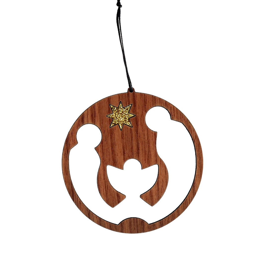 Eine im Umriss stilisierte Weihnachtskugel aus Holz, inkl. Band zum Aufhängen. Dargestellt wird die weihnachtliche Krippen-Szene, gekrönt mit einem eingelegten glitzernden Stern