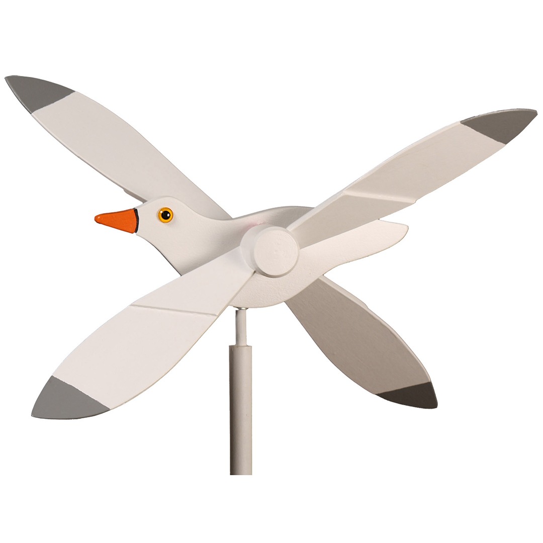 Die Möwe mit sich drehenden Flügeln wird einfach mit dem beiliegenden Holzständer waagerecht im Boden oder an einem Geländer befestigt; die Möwe richtet sich bei ausreichend Wind selbständig aus.